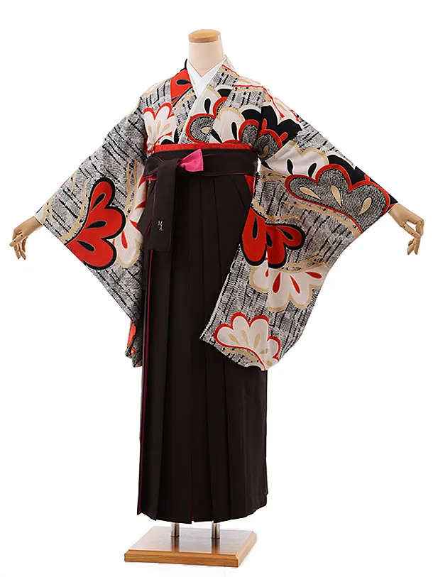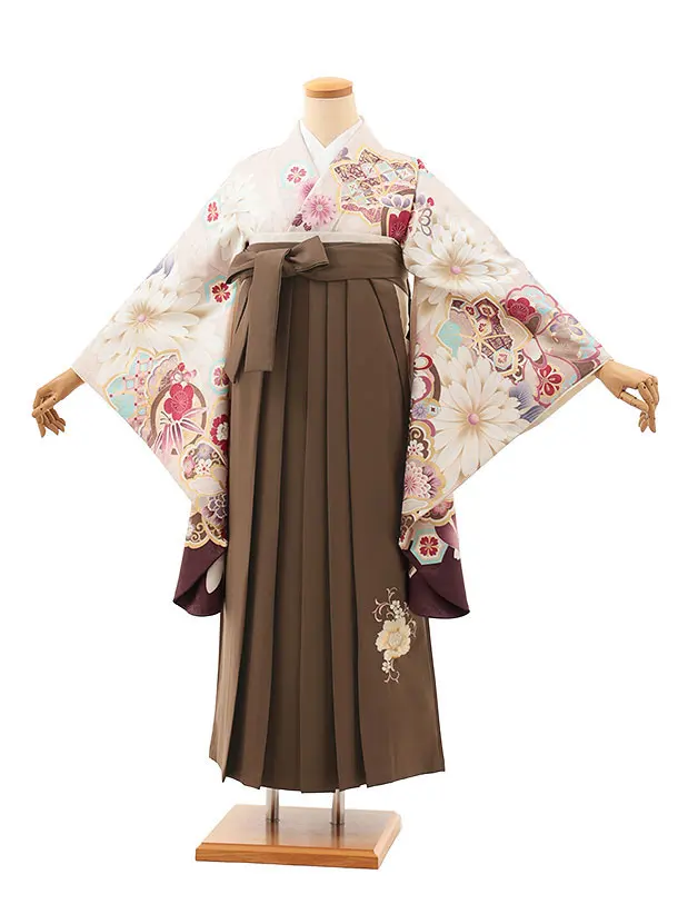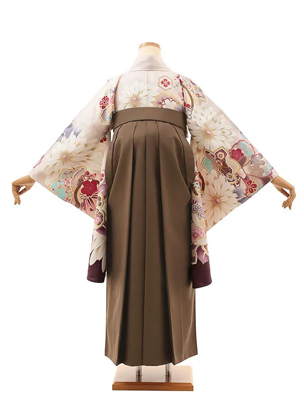 卒業式袴レンタルV826 薄ベージュ古典花×ブラウン