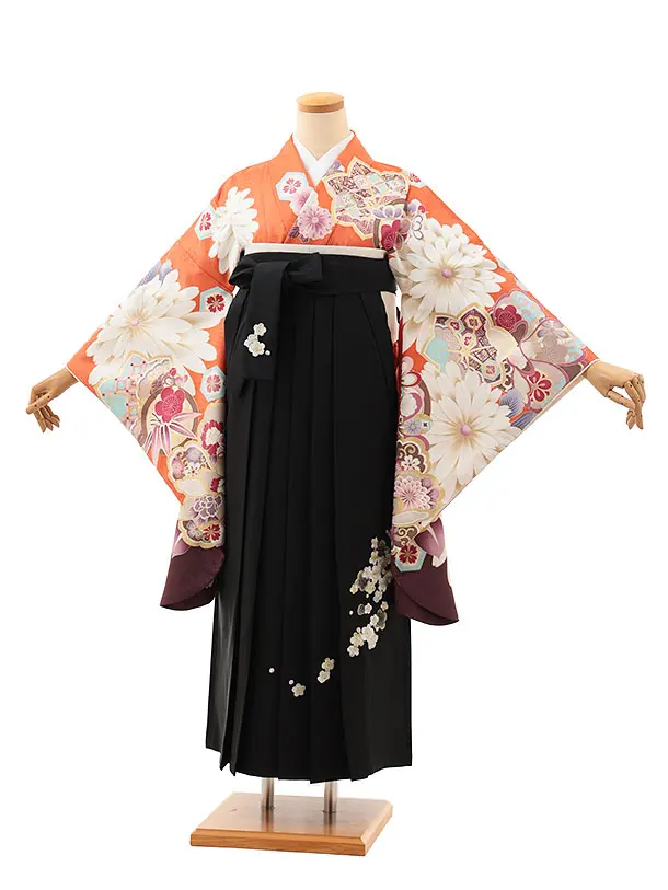 卒業式袴レンタルV829 オレンジ古典花×黒