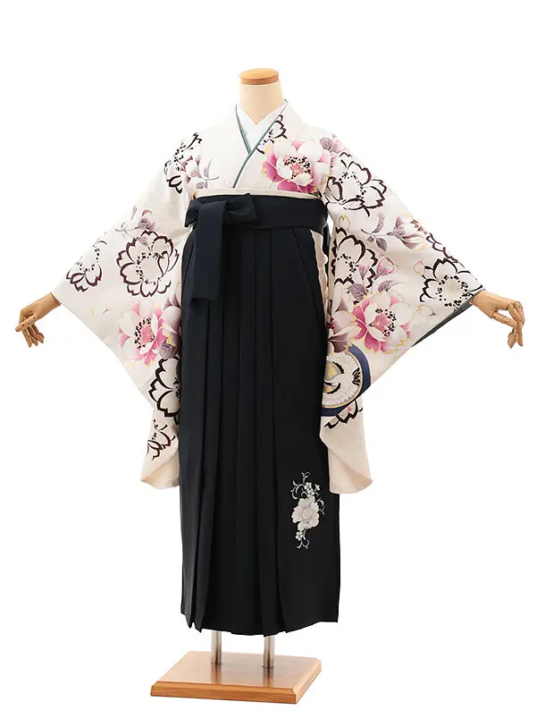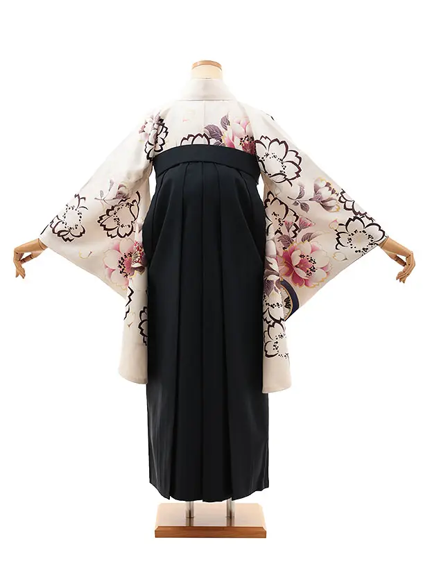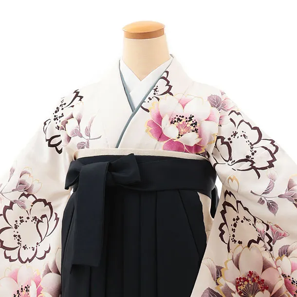 卒業式袴レンタルV836 白地 花に鶴文×紺