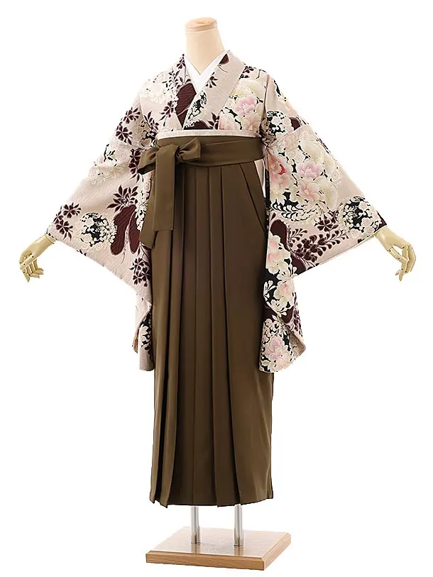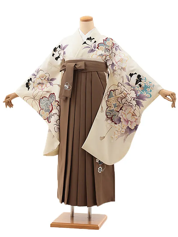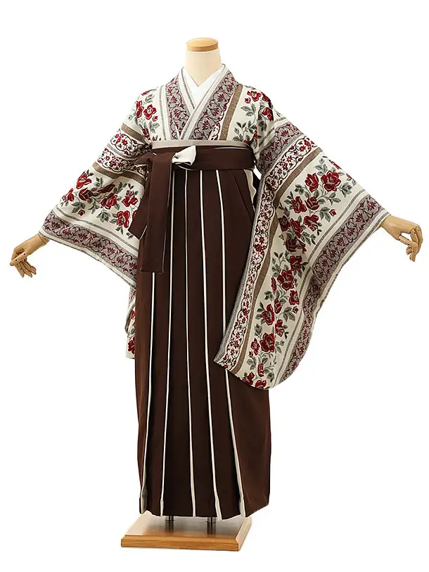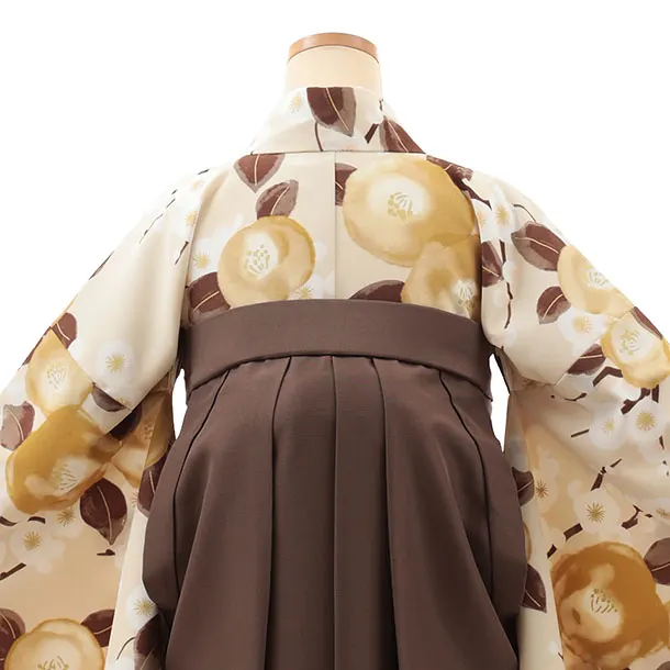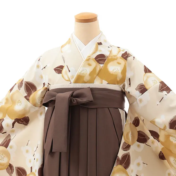 卒業式袴レンタルV893 クリームベージュ梅椿×ブラウン