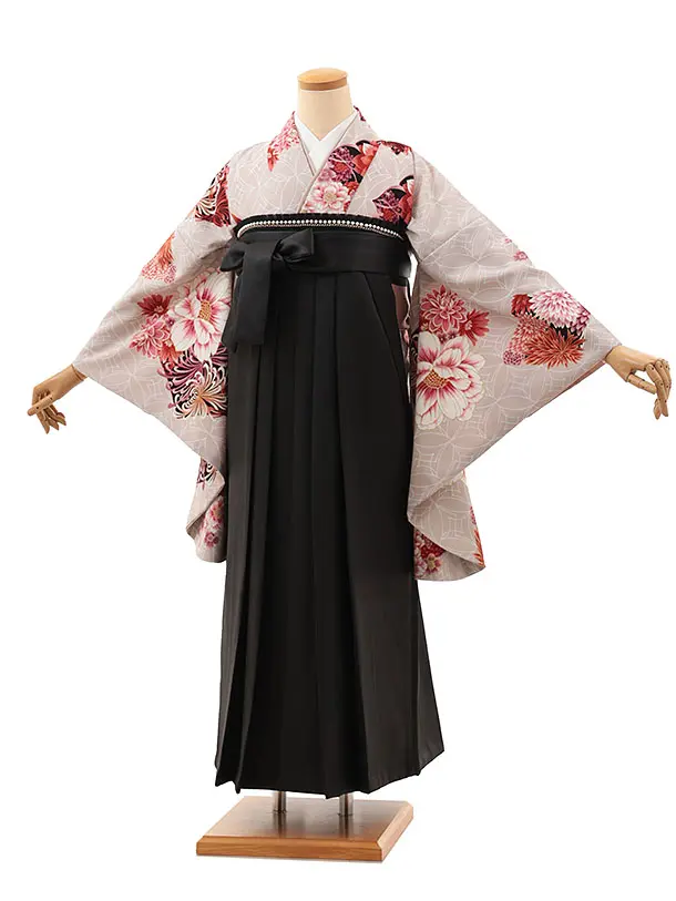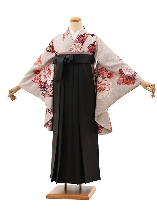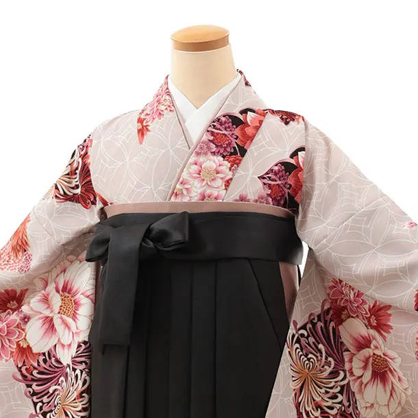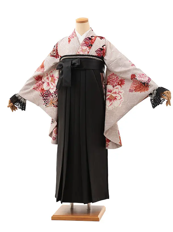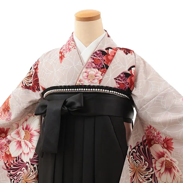 卒業式袴レンタルV897【レース】 ピンクベージュ銀通し 菱に花×黒レザー調