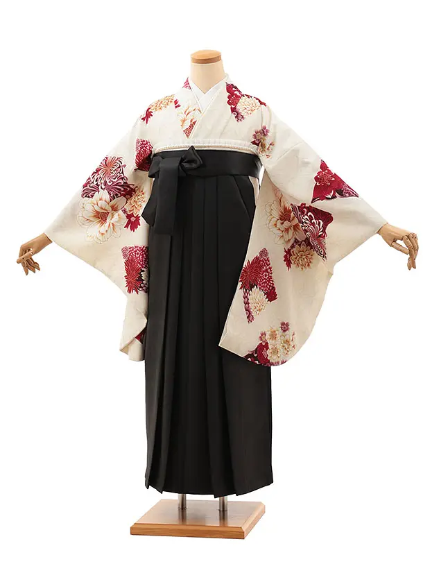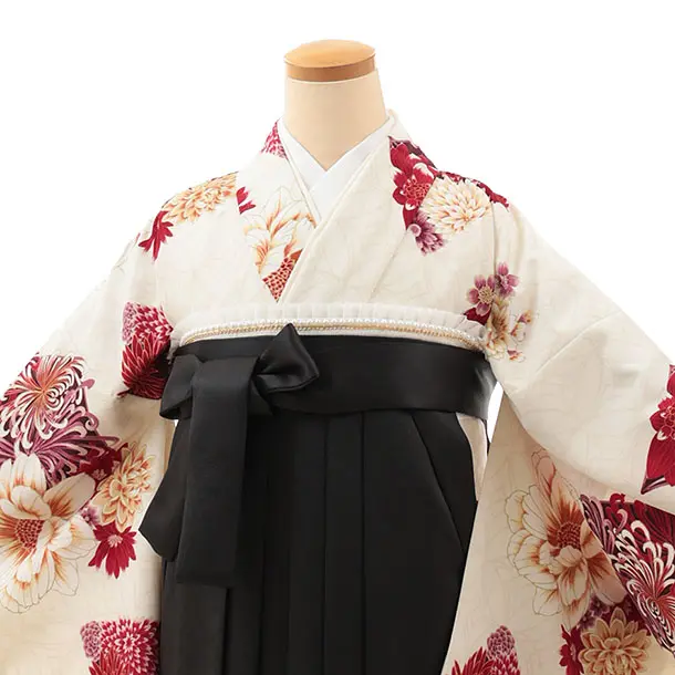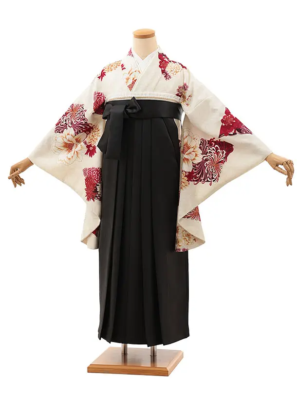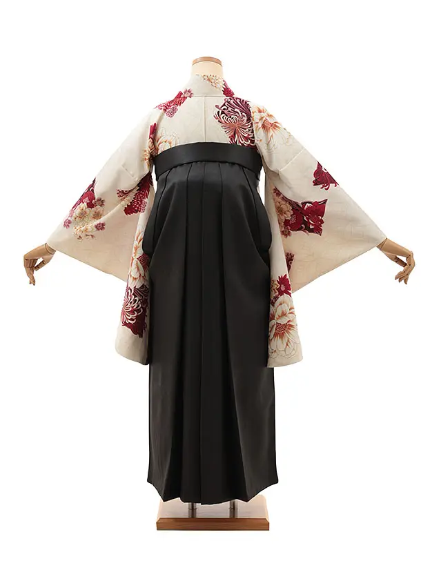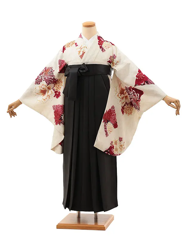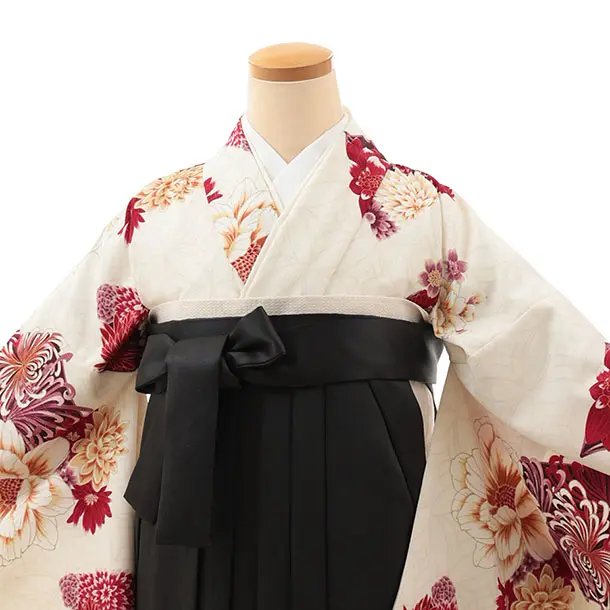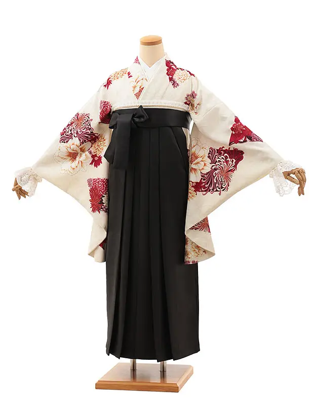卒業式袴レンタルV898【レース】 クリーム銀通し 菱に花×黒レザー調