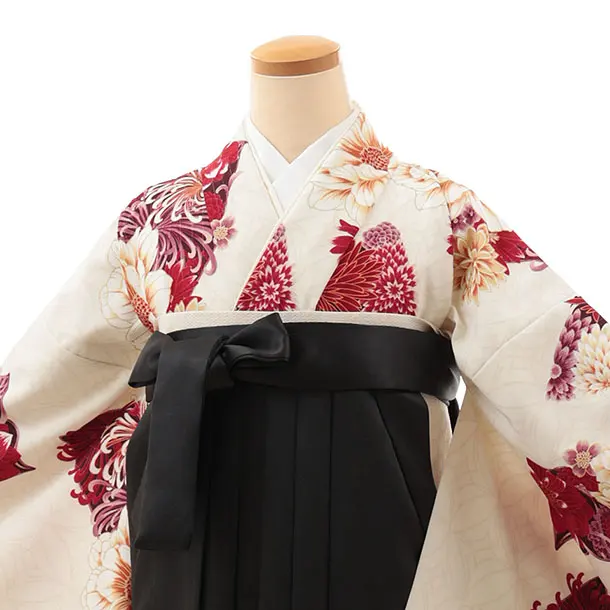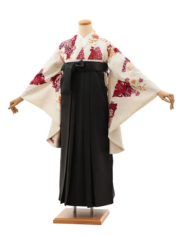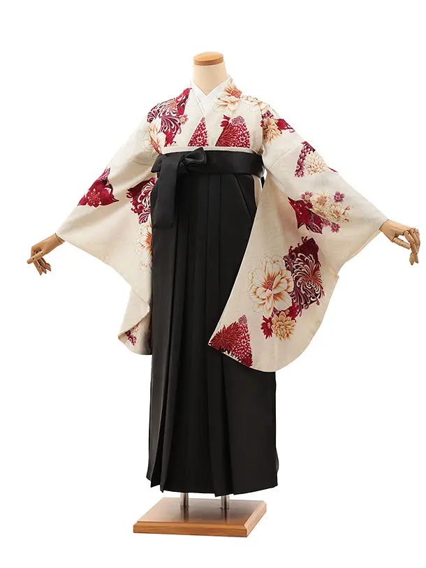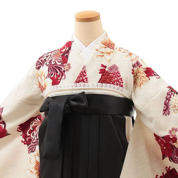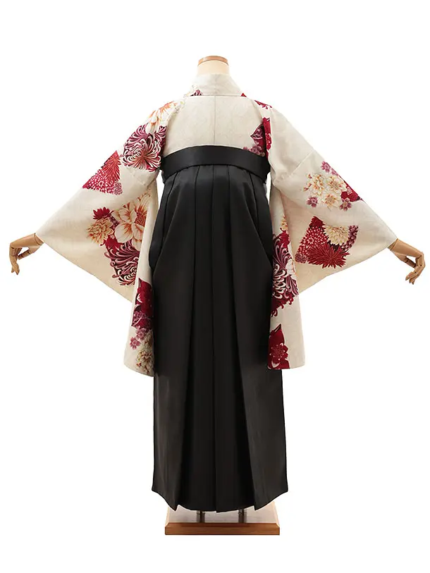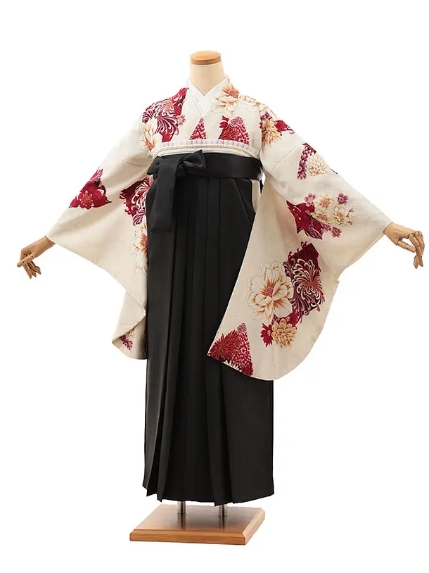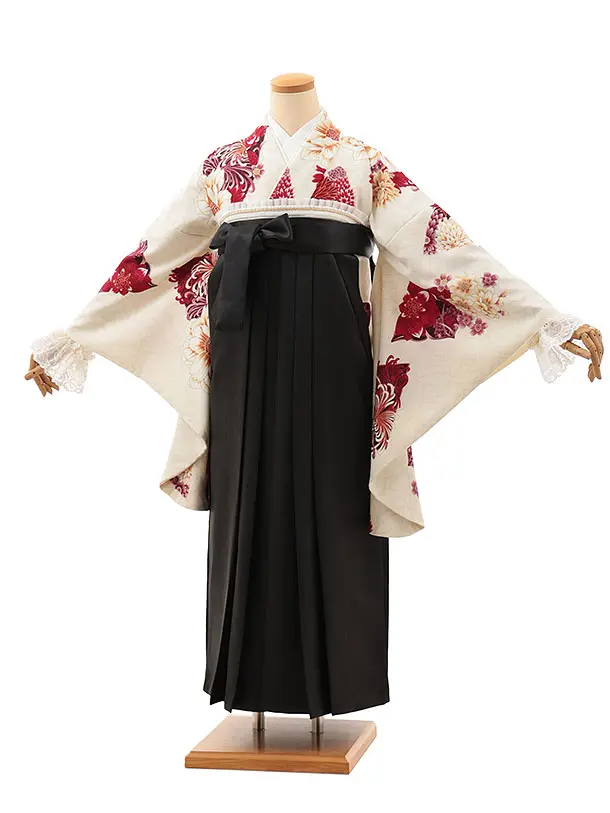 卒業式袴レンタルV899【レース】 クリーム銀通し 菱に花×黒レザー調
