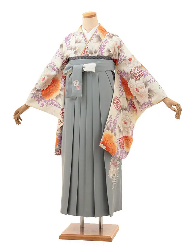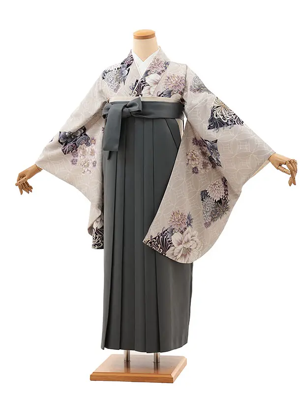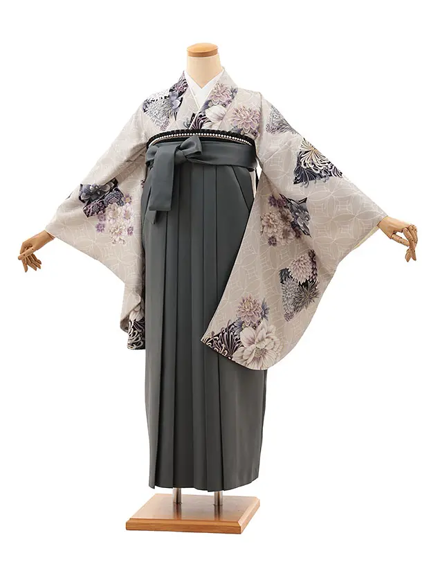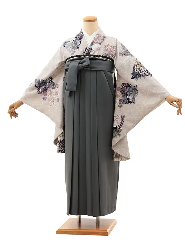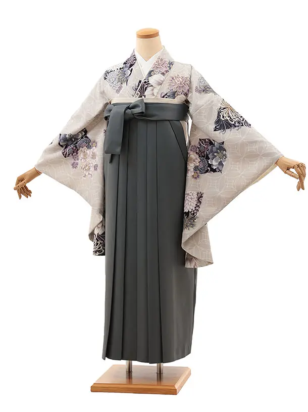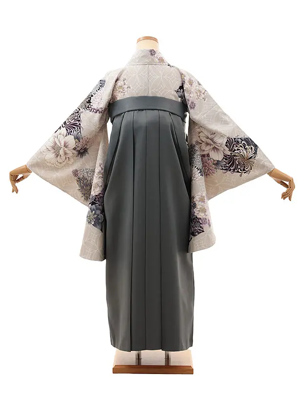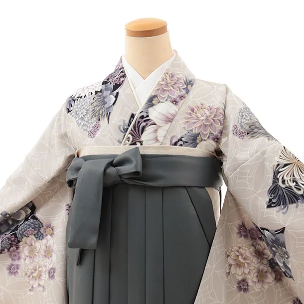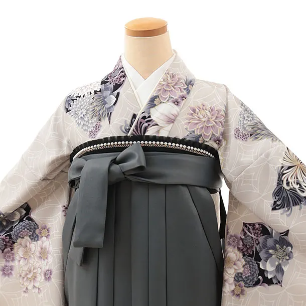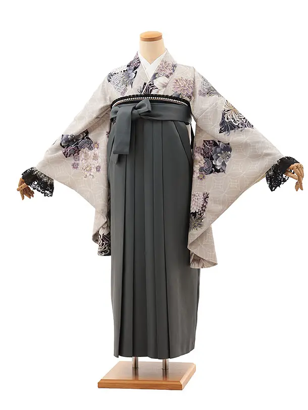 卒業式袴レンタルV901【レース】 グレージュ銀通し 菱に花×グレーレザー調