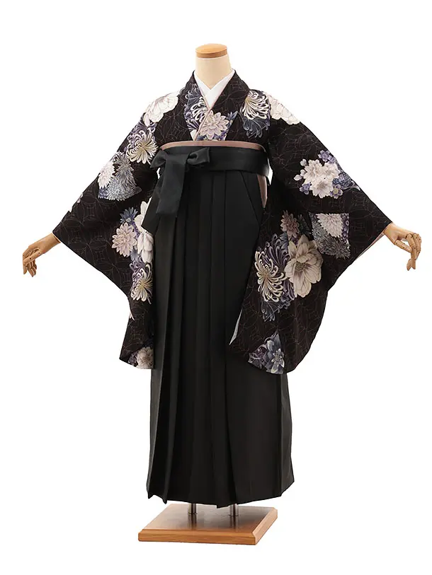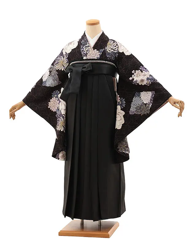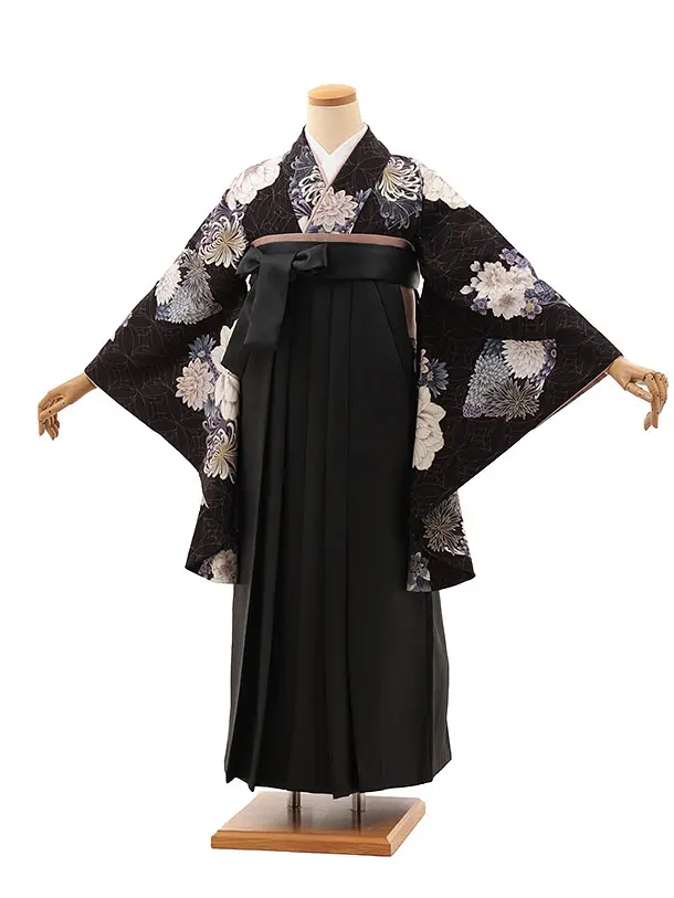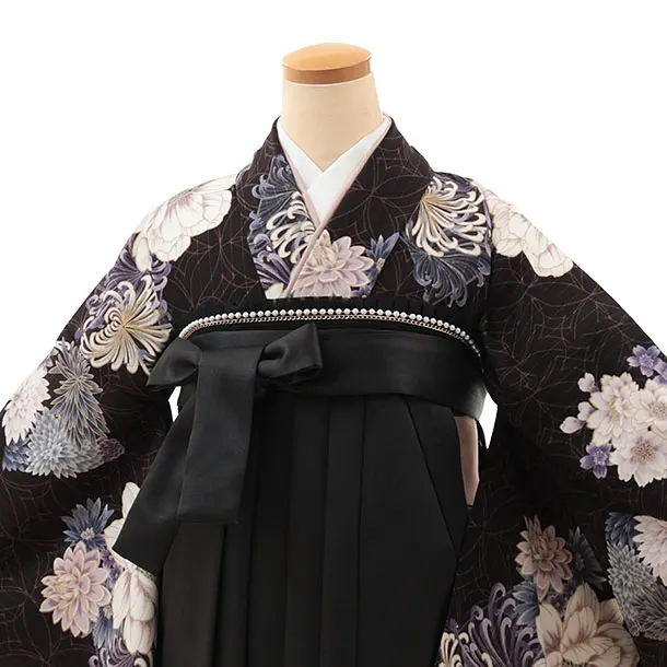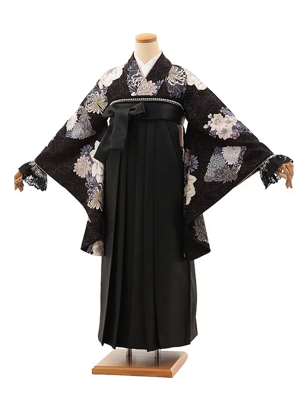 卒業式袴レンタルV902【レース】 こげ茶銀通し 菱に花×黒レザー調