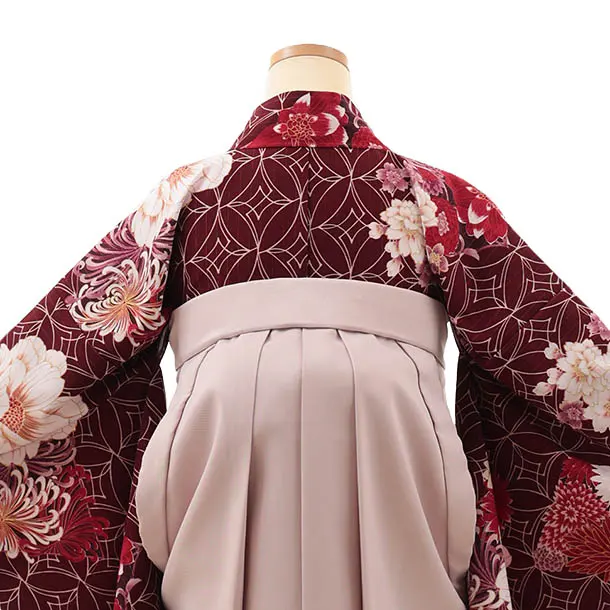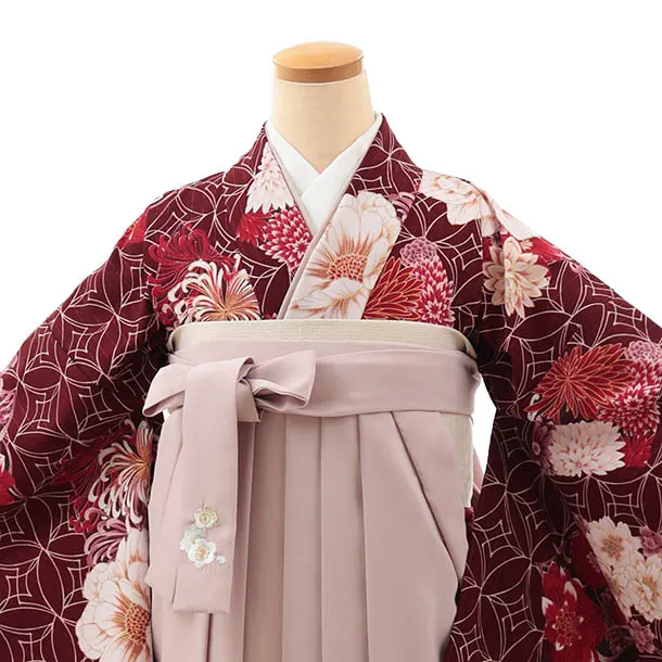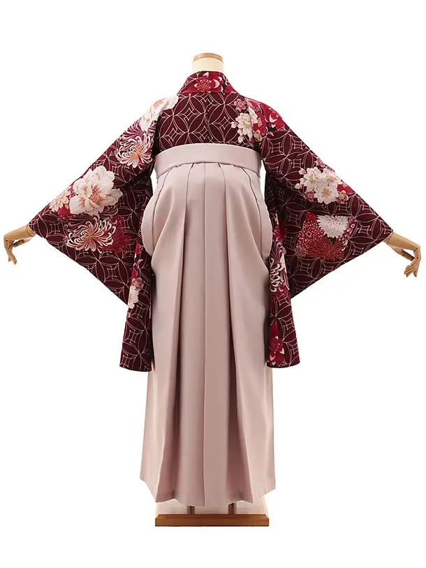卒業式袴レンタルV905 バーガンディ銀通し 菱に花×ピンク