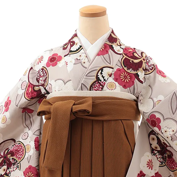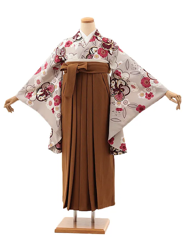 卒業式袴レンタルV915 グレージュ銀通し梅×コーデュロイキャメルブラウン