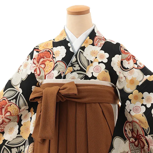 卒業式袴レンタルV919 黒銀通し梅×コーデュロイキャメルブラウン