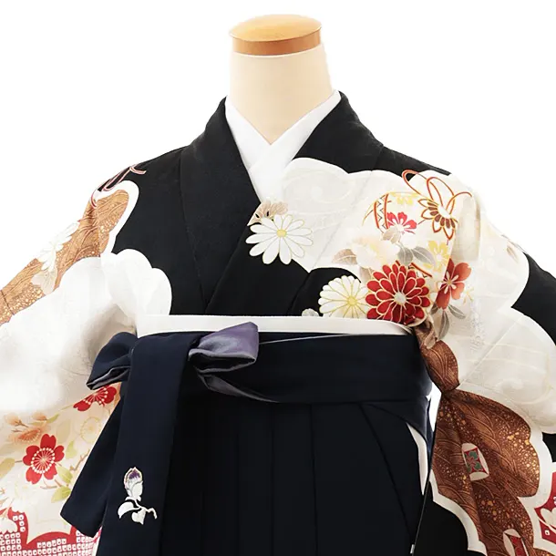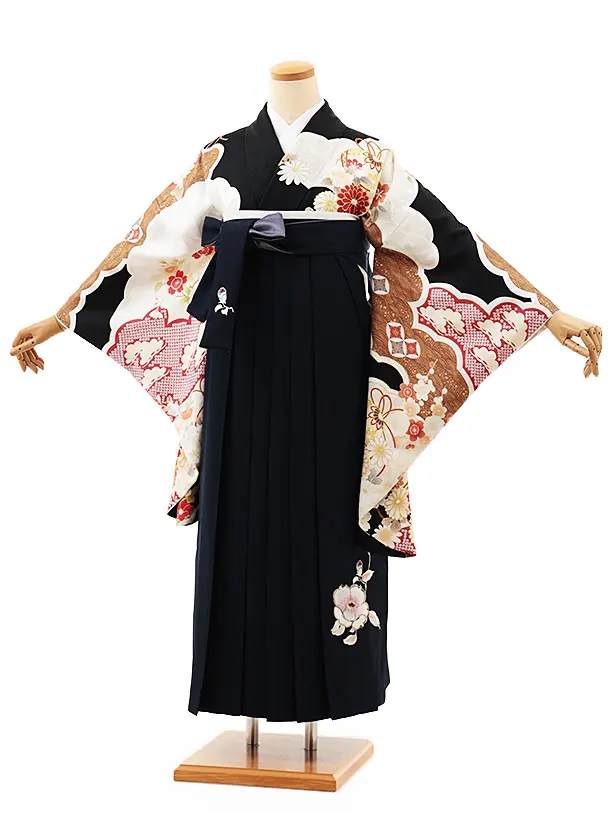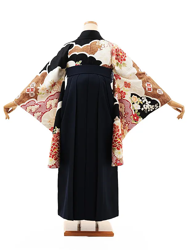 卒業式袴レンタルV921【正絹】黒地雲取り花×紺