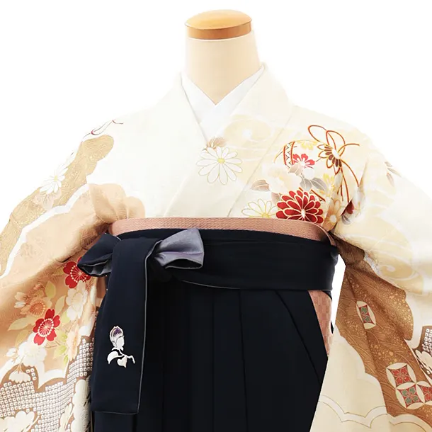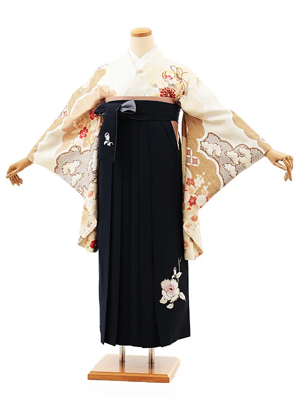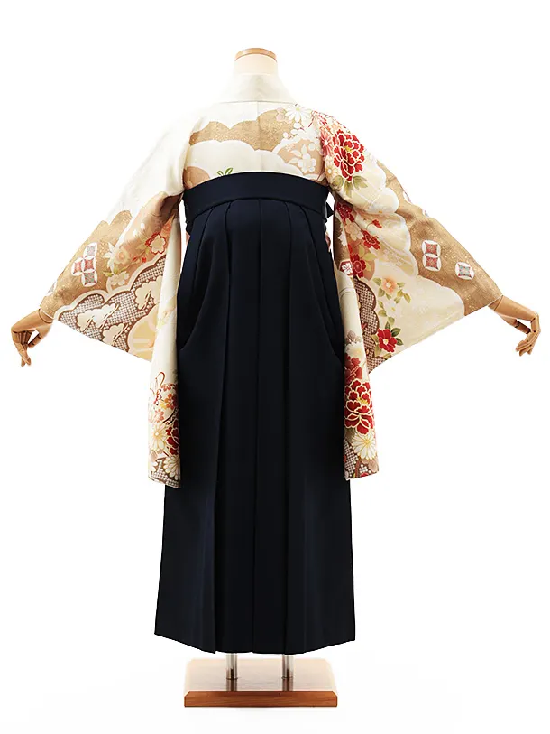 卒業式袴レンタルV928【正絹】クリーム雲取り花×紺