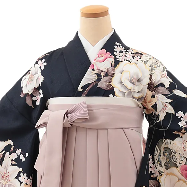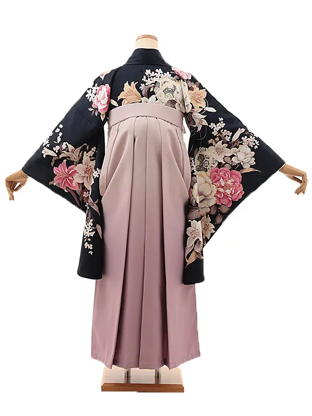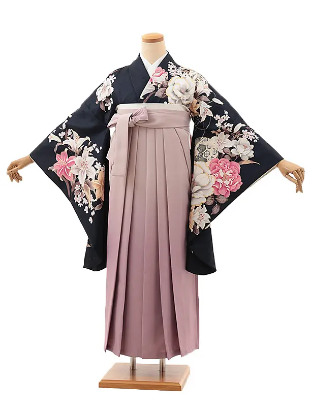 卒業式袴レンタルV935 紺地 百合牡丹×ピンクパープルぼかし