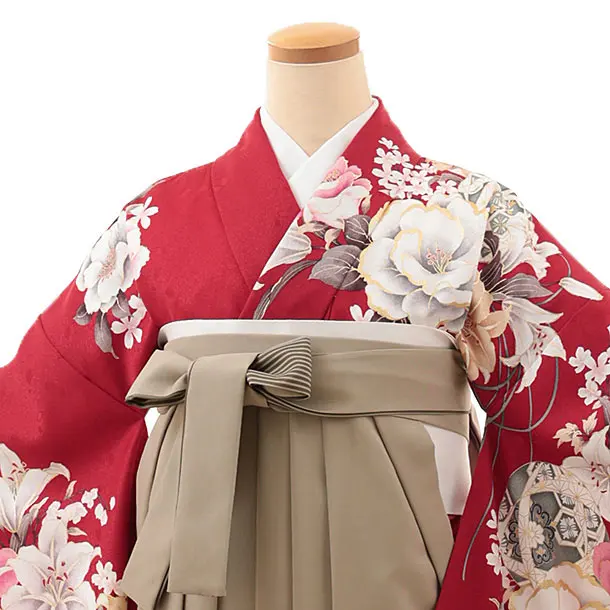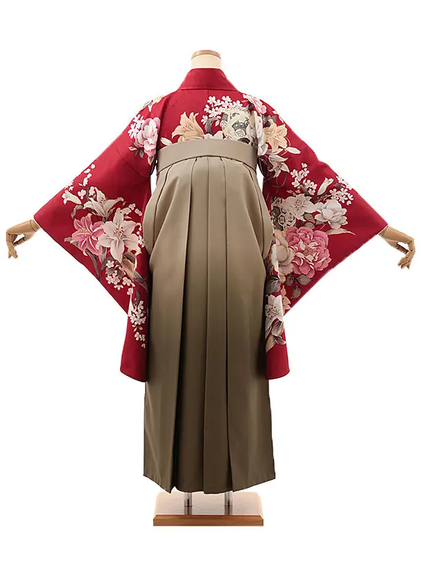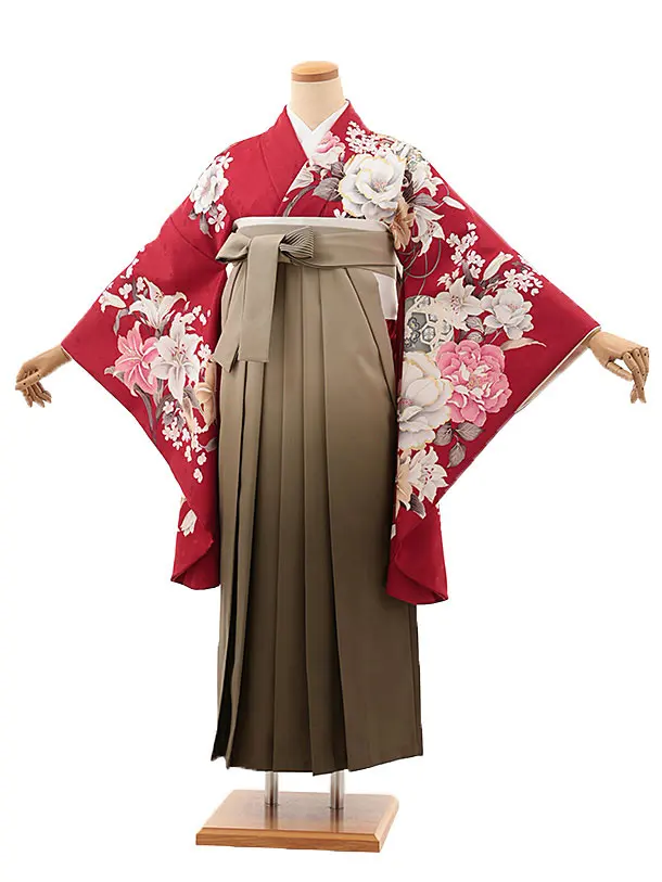 卒業式袴レンタルV936 赤地 百合牡丹×モカベージュぼかし