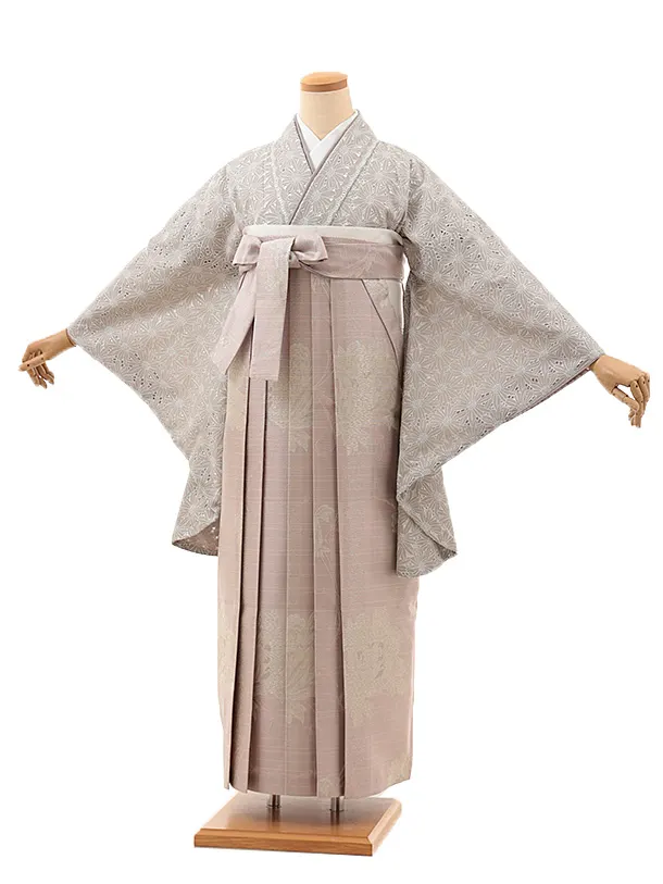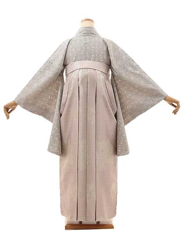 卒業式袴レンタルV988 グレージュレース×ピンクパープルラメ花