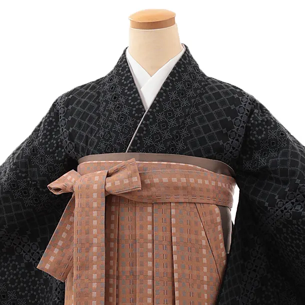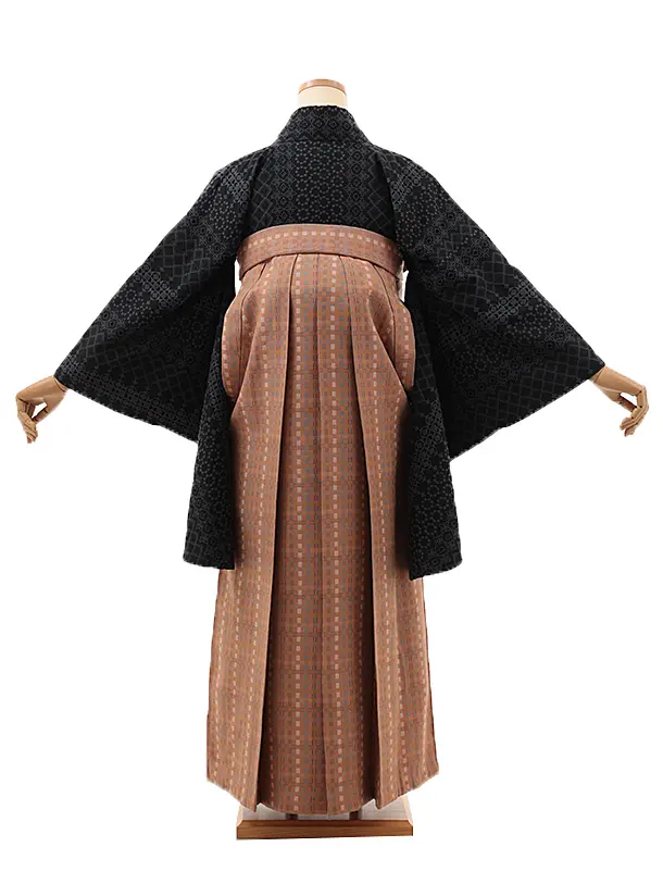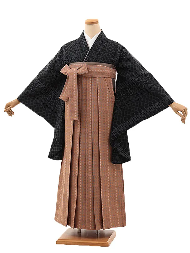 卒業式袴レンタルV992 ブラックレース×ピンクベージュ格子