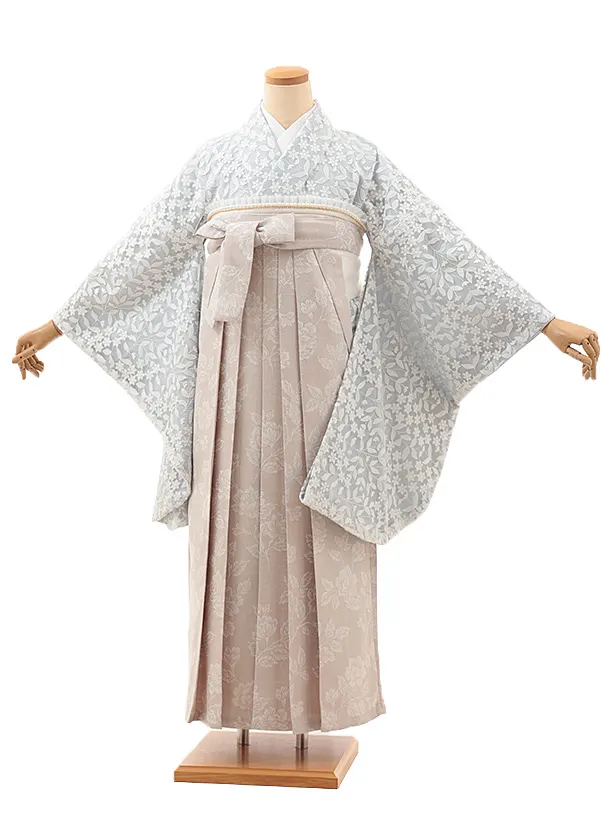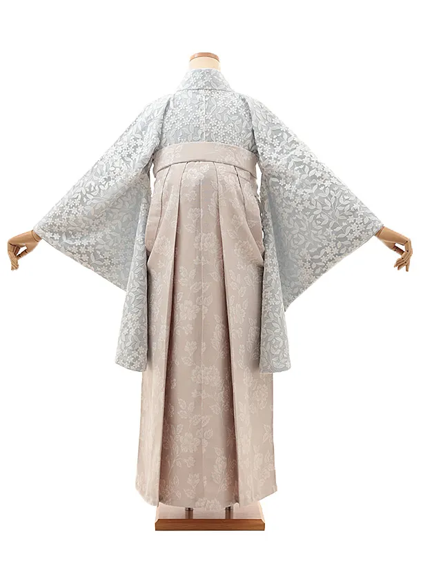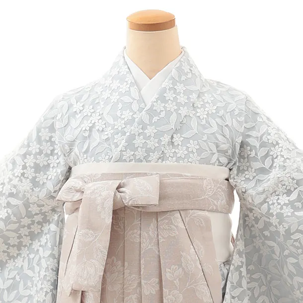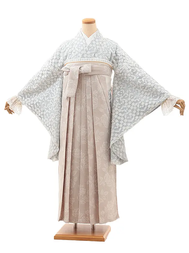 卒業式袴レンタルV999【レース ペールブルー小花リーフレース×ピンクベージュ花