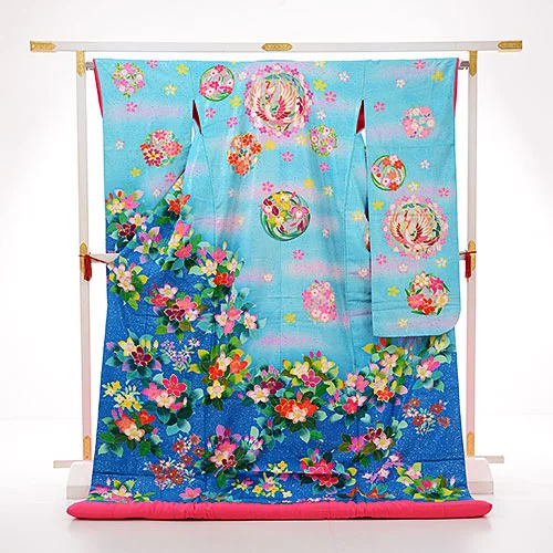 色打掛レンタルE163 水色 グリッター 鳳凰に花