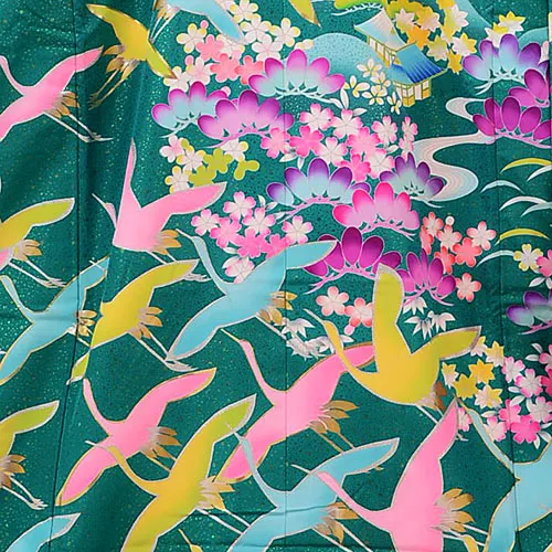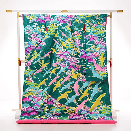 色打掛レンタルE177 グリーン地 グリッター 花鶴