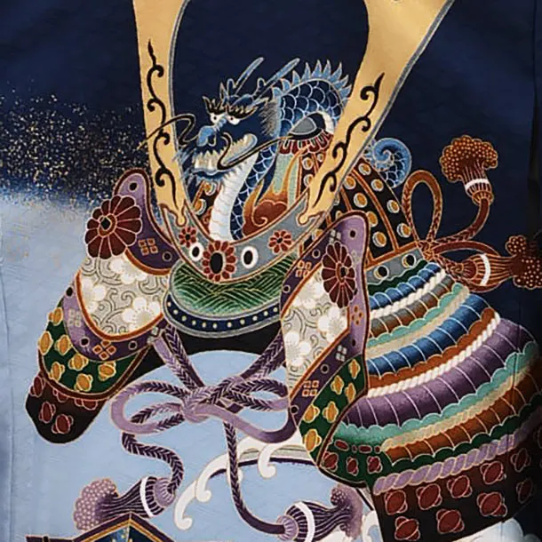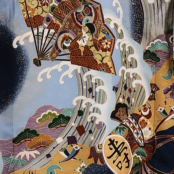 紺色に、兜が描かれたお着物です。荒波を背景に、勇壮な兜と扇や小槌などのおめでたい柄が華やかで豪華な雰囲気です。正統派の装いとして、神社へのお宮参りや記念撮影におすすめです。