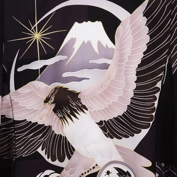 黒地に、富士山と鷹が描かれたお着物です。雄大な富士山を背景に、大きな翼を広げて舞う鷹が、力強く勇ましい雰囲気です。シックな色使いとシンプルなデザインが現代的な美しさを併せ持った一枚です。