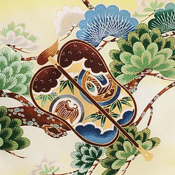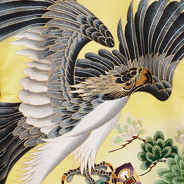 黄色に、鷹が描かれたお着物です。鮮やかな黄色に、勇壮に舞う鷹が映え、大変華やかな雰囲気です。お子様の健やかなる成長を願う日にふさわしい一枚です。