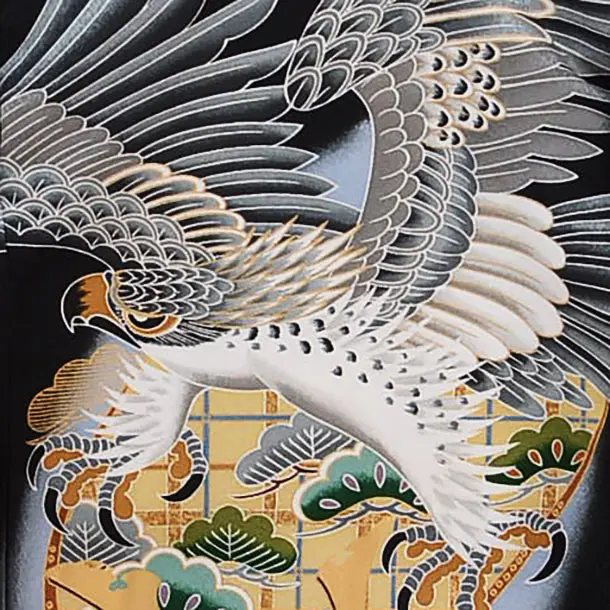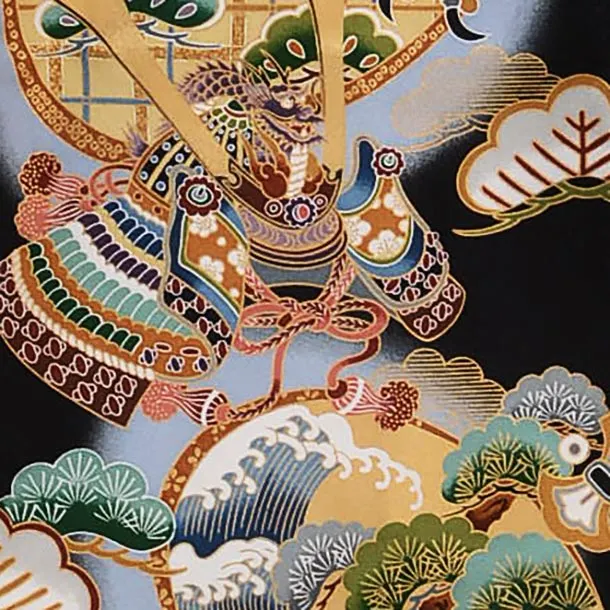 黒地に、鷹が描かれたお着物です。シックな黒に、勇ましい鷹が映え、大変豪華な雰囲気です。背景の兜や松が華やかな印象をより一層引き立てます。お子様の健やかなる成長を願う日にふさわしい一枚です。