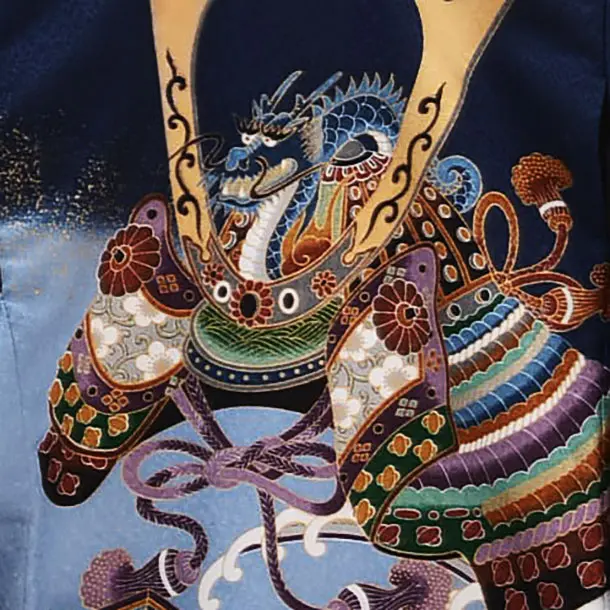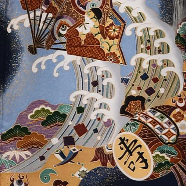 紺地に、兜が描かれたお着物です。荒波を背景に、勇壮な兜と扇や小槌などのおめでたい柄が華やかで豪華な雰囲気です。正統派の装いとして、神社へのお宮参りや記念撮影におすすめです。