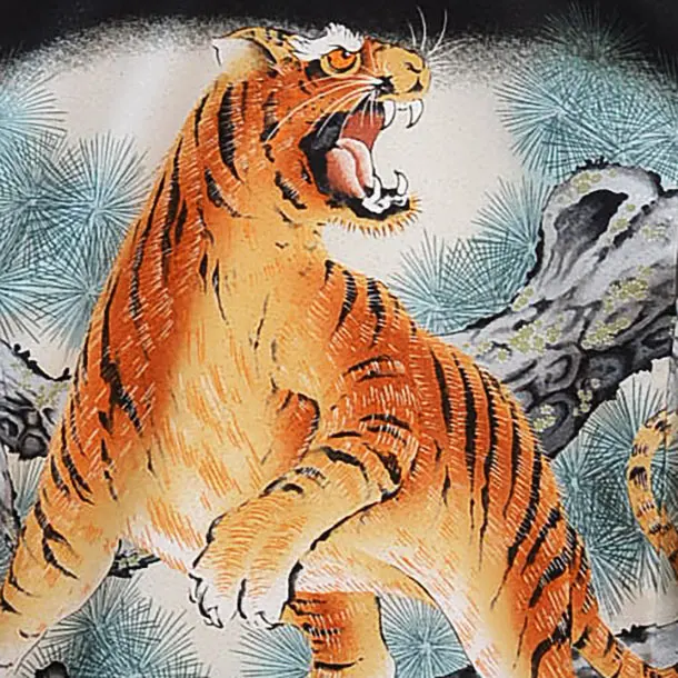 黒地に、虎が描かれたお着物です。荒々しい波と雄々しい虎が勇ましい印象です。水墨画のようなタッチで描かれた松の幹が力強い雰囲気をより一層引き立てます。