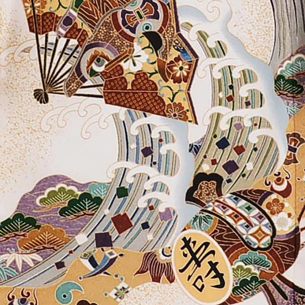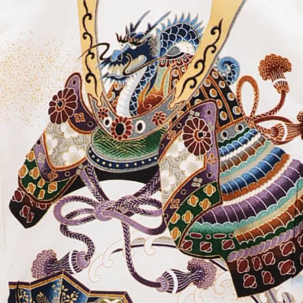 白地に、兜が描かれたお着物です。荒波を背景に、勇壮な兜と扇や小槌などのおめでたい柄が華やかで豪華な雰囲気です。正統派の装いとして、神社へのお宮参りや記念撮影におすすめです。