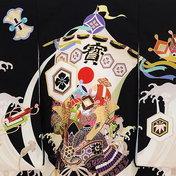 黒地に、宝舟と兜が描かれたお着物です。シックな黒に、縁起の良い宝舟と凛々しい兜が鮮やかな色使いで描かれており、華やかで豪華な雰囲気です。神社へのお宮参りの晴れ着や記念撮影にオススメです。