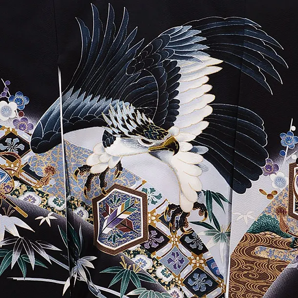 黒地に、竹と鷹が描かれたお着物です。シックな黒に正統派な柄が映え、上品で格調高い雰囲気です。お子様の健やかなる成長を願う日にふさわしい一枚です。