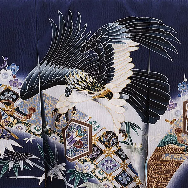 紺地に、宝尽くしと鷹が描かれたお着物です。雄々しい鷹と縁起の良い宝尽くし柄がおめでたい華やかな雰囲気です。背景の松竹梅が格調高い美しさを添えます。