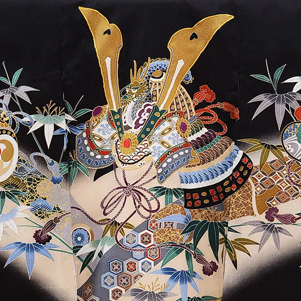 黒地に、竹と兜が描かれたお着物です。シックな黒に正統派な柄が映え、上品で格調高い雰囲気です。お子様の健やかなる成長を願う日にふさわしい一枚です。