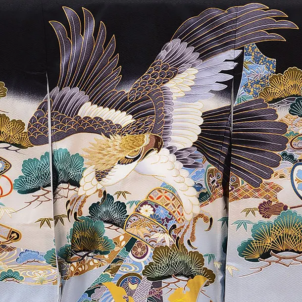 黒地に、熨斗(のし)、鷹、兜が描かれたお着物です。勇壮に舞う鷹と、大きく大胆に描かれた熨斗(のし)、豪華な兜がおめでたい華やかな印象です。正統派の装いとして、神社へのお宮参りの晴れ着や記念撮影にオススメです。