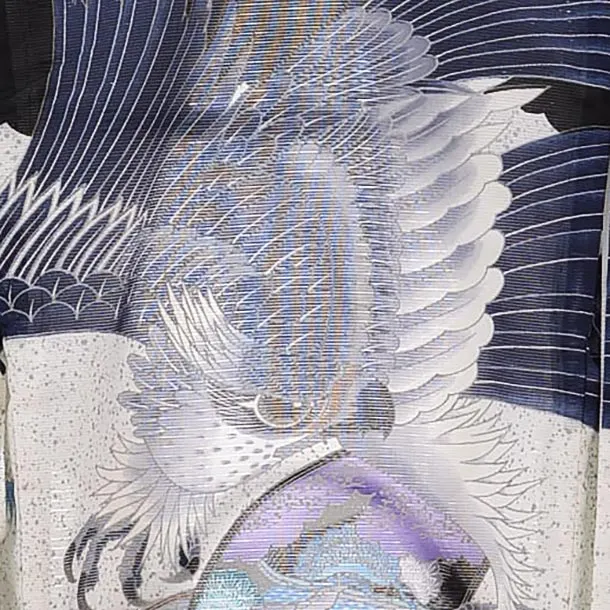 黒地に、鷹と扇が描かれたお着物です。大きく翼を広げた鷹と扇が優雅で美しい雰囲気です。