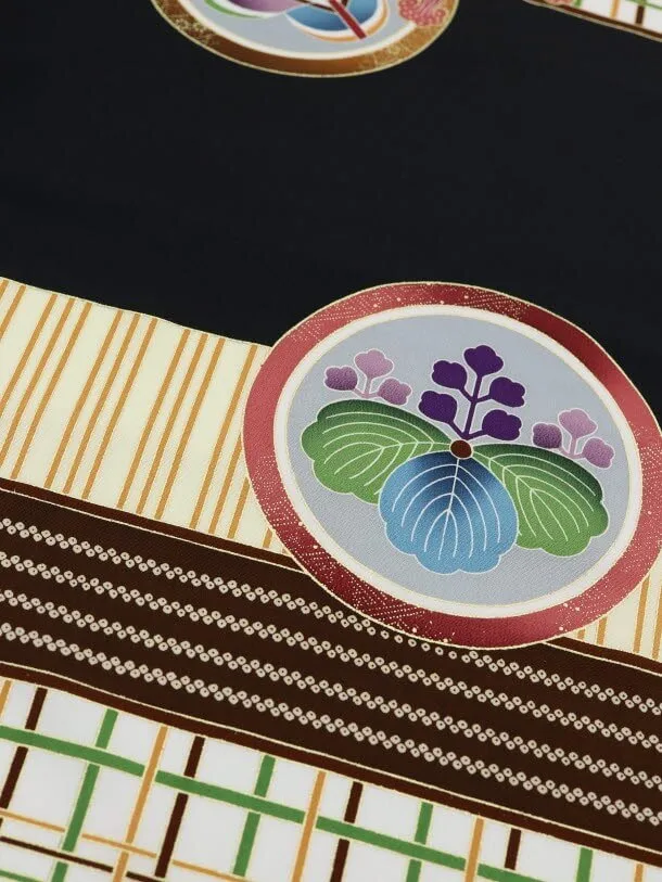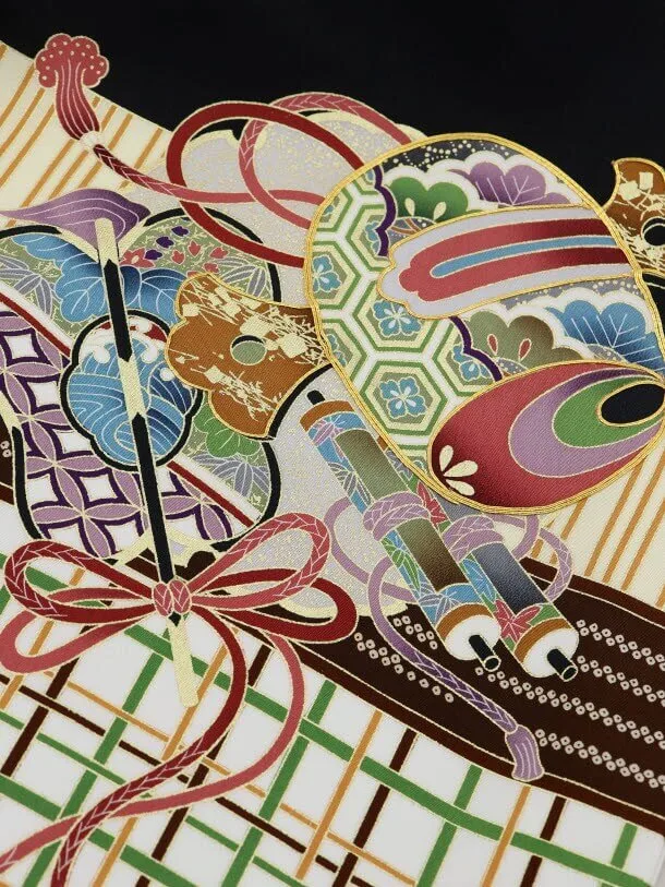 黒地に、小槌が描かれたお着物です。小槌と軍配、周りに散りばめられた丸紋様がおめでたい華やかな雰囲気です。正統派な装いとして、お子様の健やかなる成長を願う日にふさわしい一枚です。