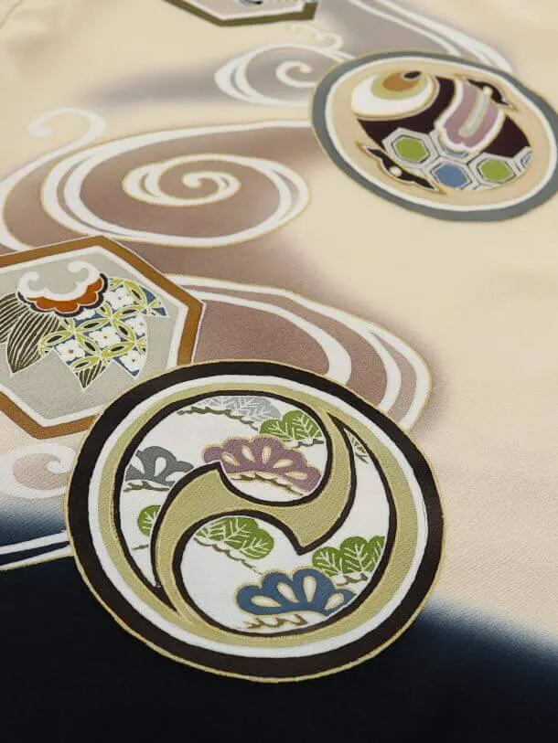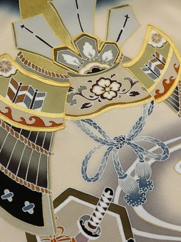 黒地に、前田家兜が描かれたお着物です。歴史の中でも人気の高い前田家の兜は凛々しく力強い雰囲気です。豪華な兜と上品な柄が格調高い美しさを添えます。