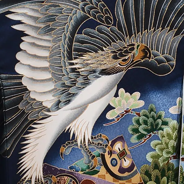 紺地に、松と鷹が描かれたお着物です。落ち着いた紺地に鮮やかに描かれた鷹と松が映え、華やかで豪華な雰囲気です。お子様の健やかなる成長を願う日にふさわしい一枚です。