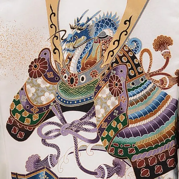 白地に、扇と兜が描かれたお着物です。すっきりとした白に兜や扇、小槌などの縁起柄が映え、おめでたい華やかな雰囲気です。正統派な装いとして、お子様の健やかなる成長を願う日にふさわしい一枚です。