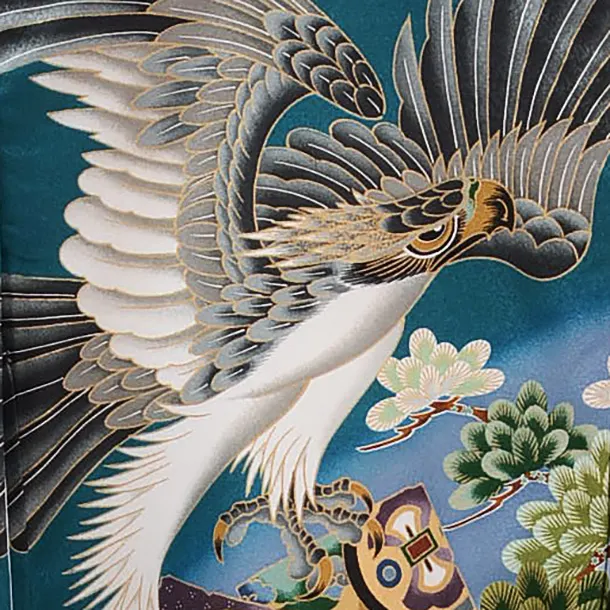 グリーン地に、松と鷹が描かれたお着物です。シックなグリーンに鮮やかに描かれた鷹と松が映え、華やかで豪華な雰囲気です。お子様の健やかなる成長を願う日にふさわしい一枚です。