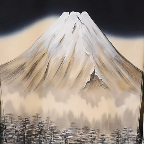 黒地に、富士山が描かれたお着物です。シックな黒に落ち着いた色合いで描かれた松や富士山が上品で格調高い雰囲気です。おめでたい縁起の良い柄は、神社へのお宮参りの晴れ着や記念撮影にオススメです。