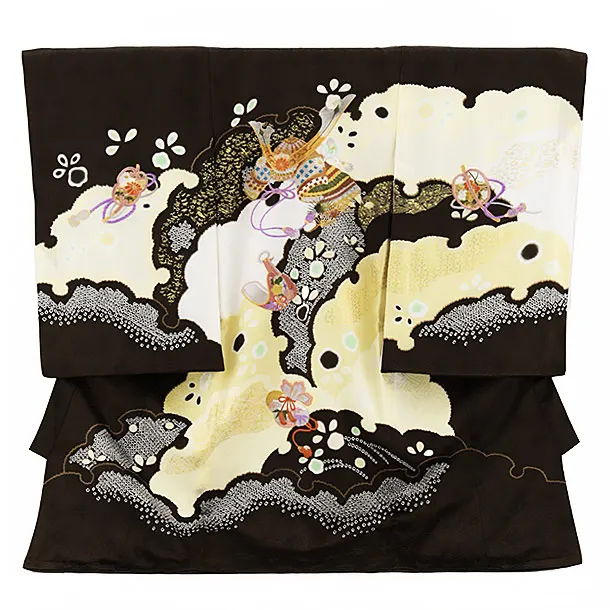 茶色地に、波と鷹が描かれたお着物です。打ち寄せる波を背景に大きく翼を広げ羽ばたく鷹が勇ましい雰囲気です。シックな茶色に鮮やかな色使いの柄が映え、華やかな美しさをより一層引き立てます。