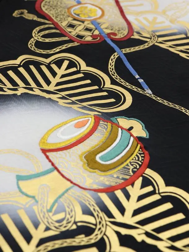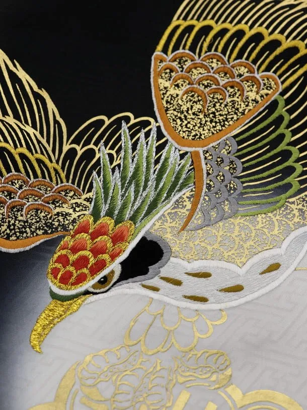 黒地に、鷹と軍配が描かれたお着物です。大きく翼を広げた鷹は刺繍が施されており、豪華で華やかな雰囲気です。正統派な柄は格調高い美しさをより一層引き立てます。