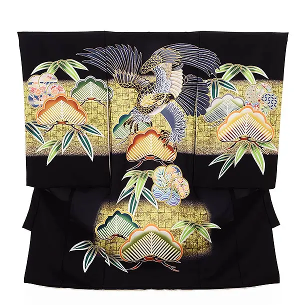 黒地に、雲と鷹が描かれたお着物です。シックな色使いの背景に、雄々しい鷹が華やかに舞い、格調高い雰囲気です。神社へのお宮参りの晴れ着や記念撮影にオススメです。