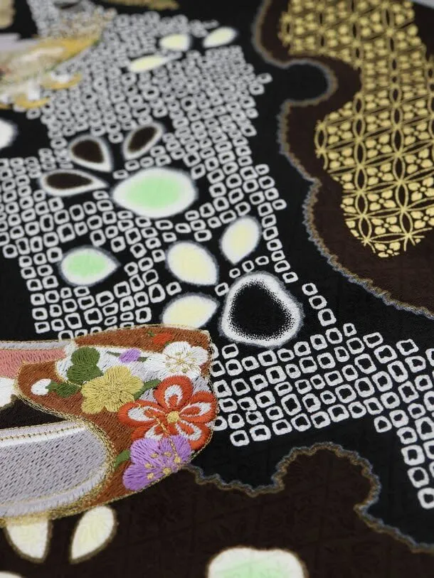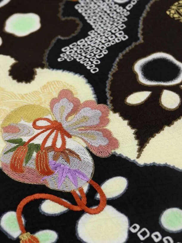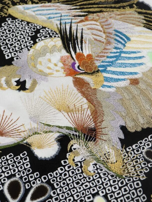 黒地に、鷹が描かれたお着物です。大きく翼を広げた鷹には刺繍が施され、豪華で華やかな印象です。背景の雪輪模様が優雅で上品な美しさを引き立てます。お子様の健やかなる成長を願う日にふさわしい一枚です。