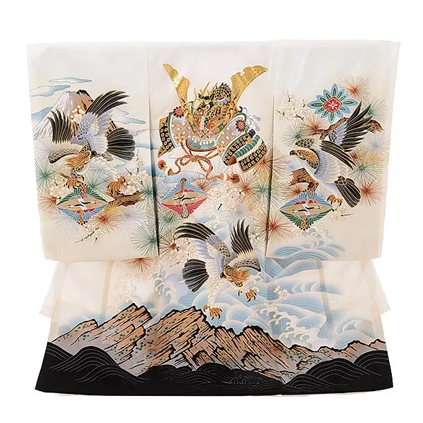 男児産着 お宮参り レンタル 正絹 1338 白地 裾黒 鷹 ししゅう