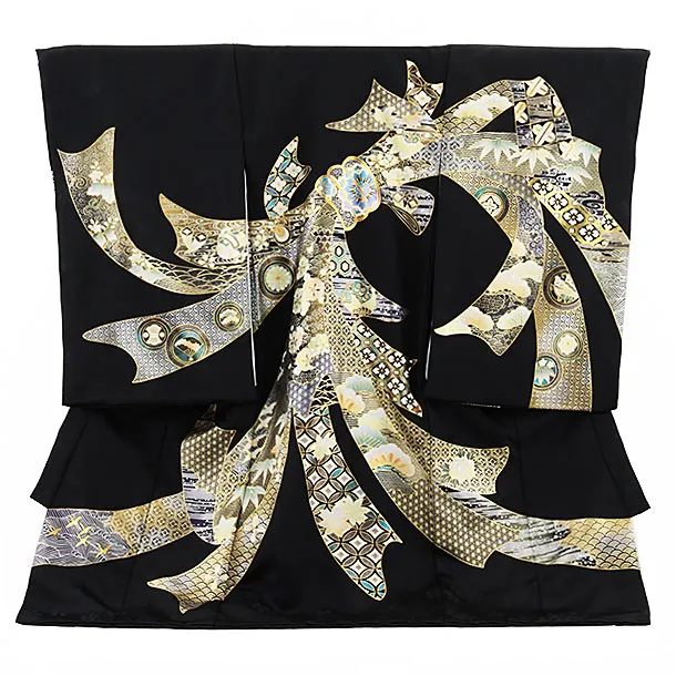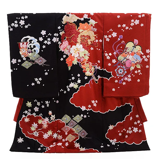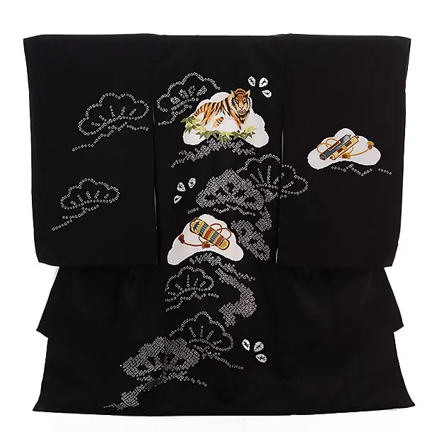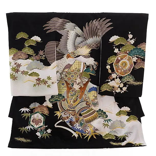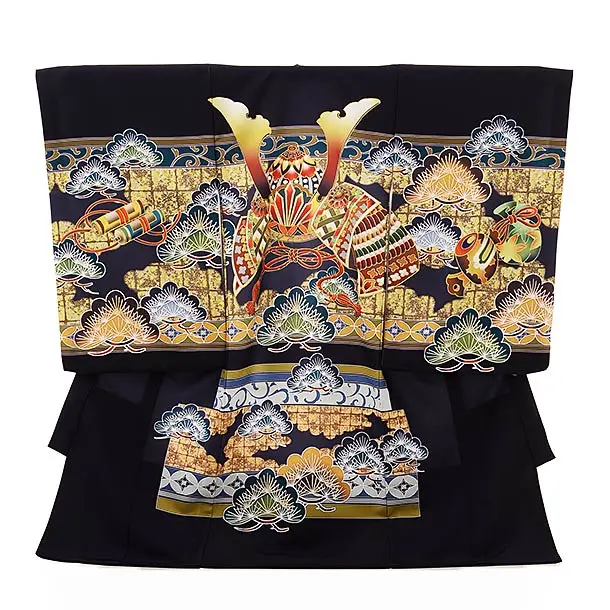 黒地に、波と兜が描かれたお着物です。打ち寄せる波を背景に凛々しい兜がたくましく力強い印象です。同柄で色違いの商品がもう1着あります。【1AL1385000】でご検索下さい。