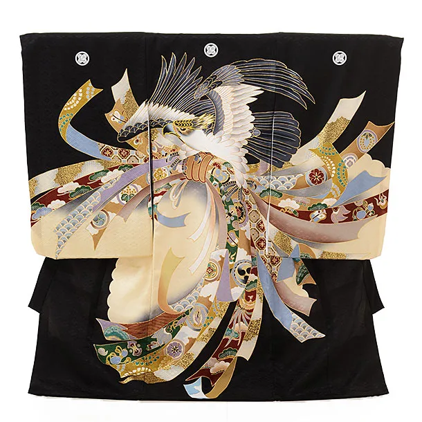 男児産着 お宮参り レンタル 正絹 1383 黒地 波にかぶと