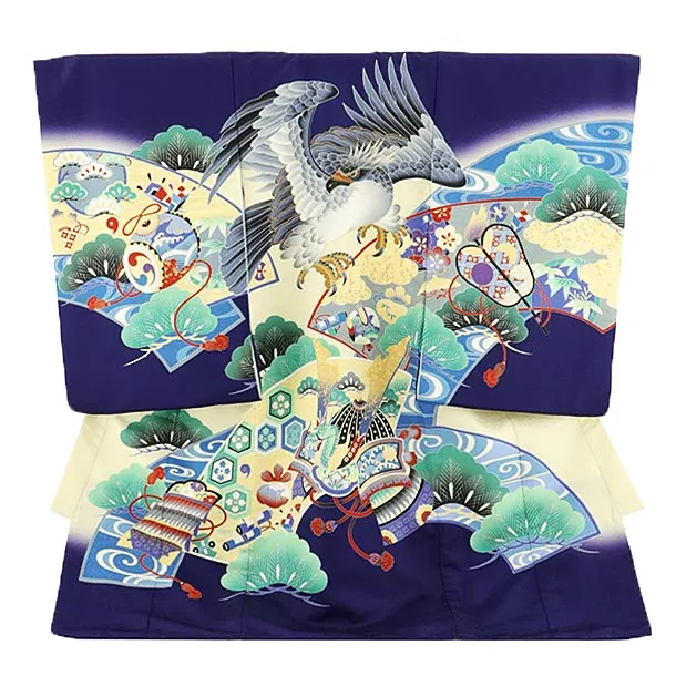 紺地に、宝船と兜が描かれたお着物です。シックな紺に宝船や兜などの縁起柄が映え、おめでたい華やかな雰囲気です。正統派な装いとして、お子様の健やかなる成長を願う日にふさわしい一枚です。