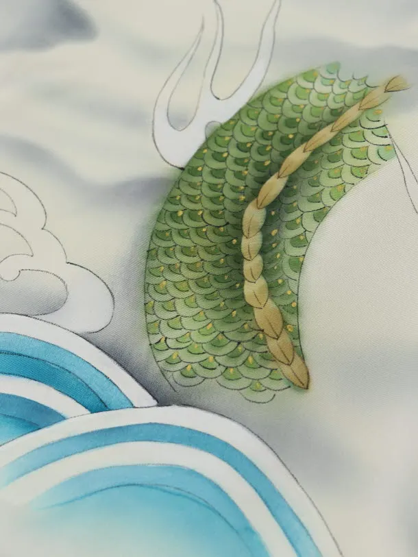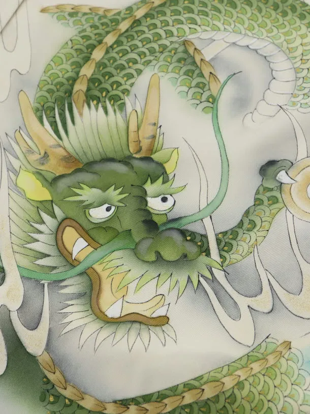 黒地に、波と龍が描かれたお着物です。荒々しい波と龍が力強く勇ましい印象です。神社へのお宮参りの晴れ着や記念撮影にオススメです。
