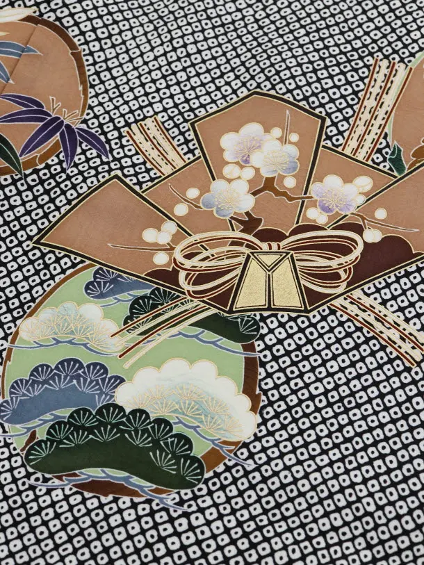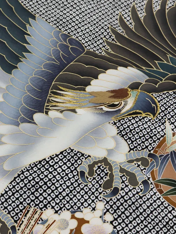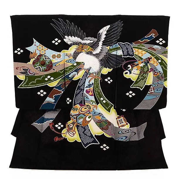 黒の絞り柄に、鷹が描かれたお着物です。雄々しい鷹と、松竹梅など縁起の良い柄が描かれ、華やかでおめでたい雰囲気です。正統派な装いとして、お子様の健やかなる成長を願う日にふさわしい一枚です。